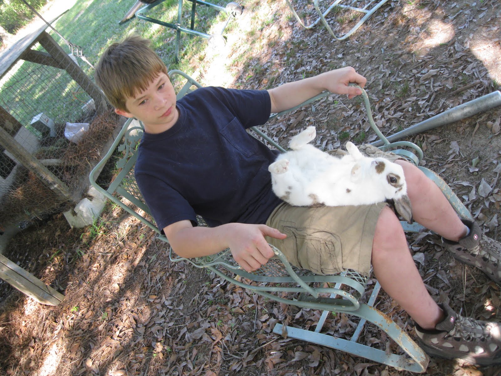 Aunt Molly taught Matt how to put the rabbits in some sort of a trance. You lay them on their backs slowly and then they just lay there. Sue, our female, is a very wild rabbit and to be able to let her go hands-free like is pretty neat. She's pretty funny laying there too. It looks like you have a dead rabbit laying in your lap.